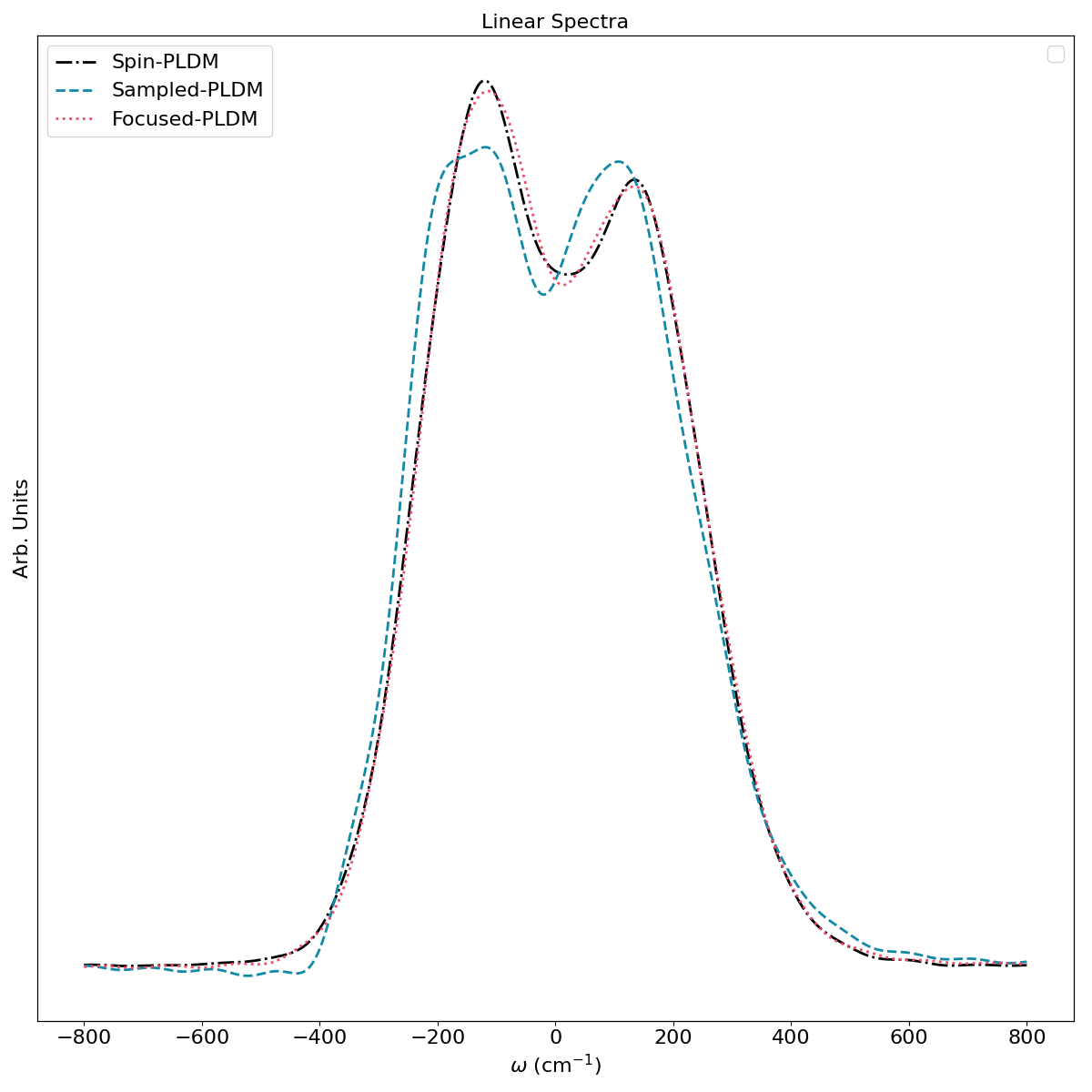 Computation of linear absorption spectra with standard and spin-based partially linearized densty matrix (PLDM) techniques.
